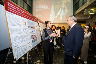 Tahereh Ghafoori explained to President Berman her role in exploring how a little-known protein, called SUMO, plays a major role in the complex biological process that creates sperm, using genetically engineered mice to study what happens when this protein is turned off.